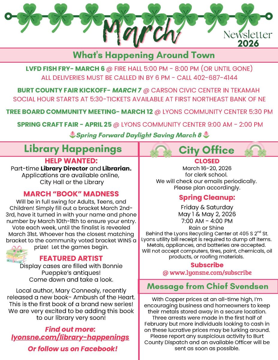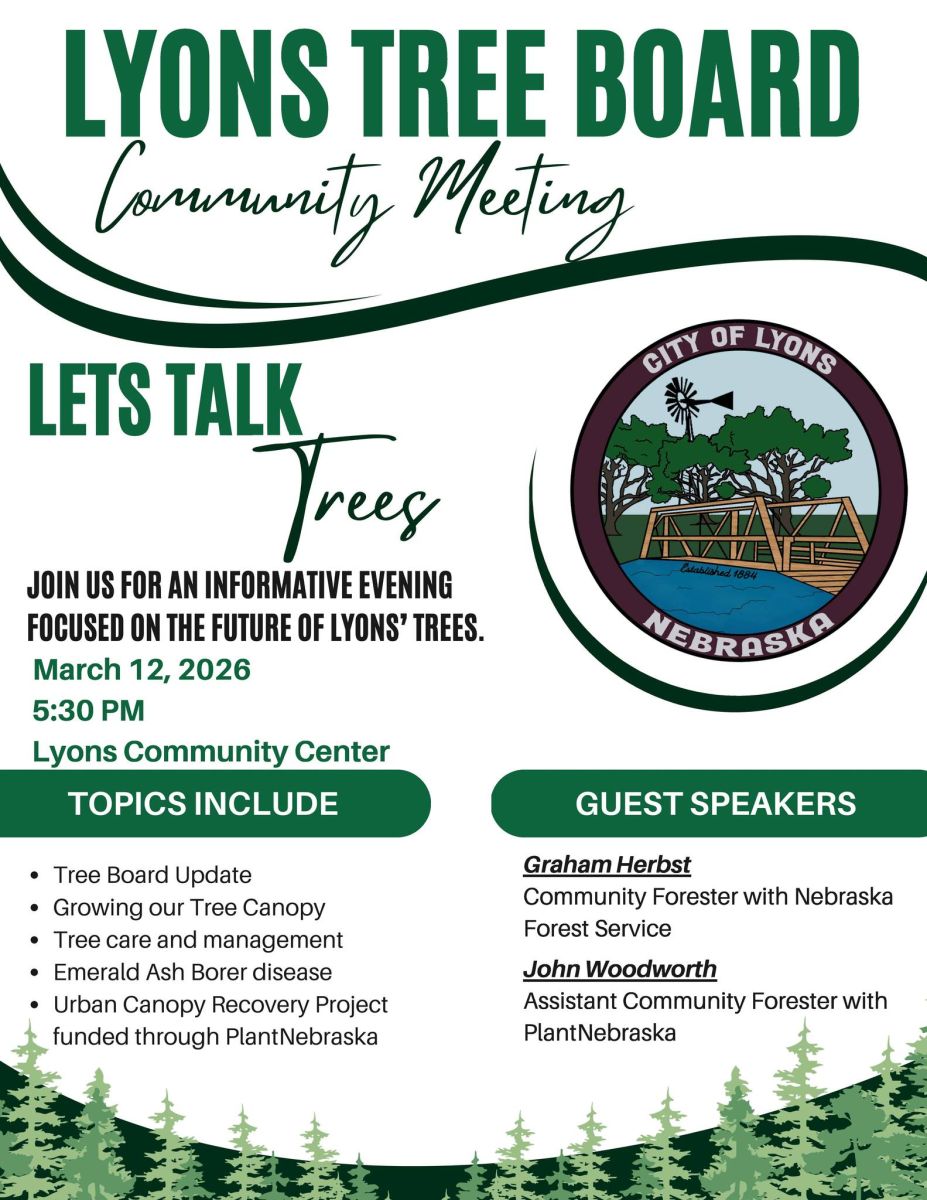 Lyons, Neb. 2/25/26– The City of Lyons was recently awarded a $256,580 Community Forestry Infrastructure grant from PlantNebraska. The grant was part of $10 million in grant funds awarded to PlantNebraska in 2024 by the USDA Forest Service Urban and...